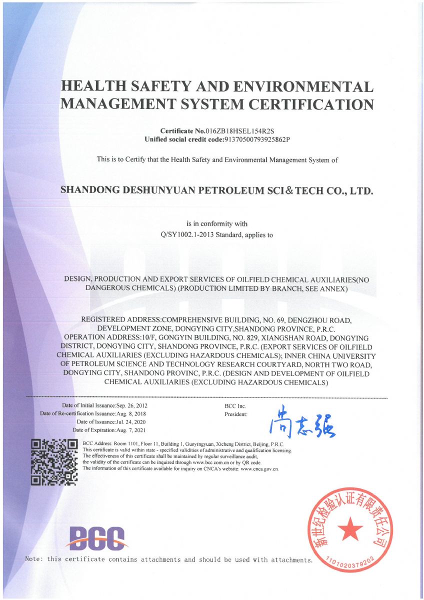 On August 13th 2020, the notice from Beijing New Century Inspection and Certification Co., Ltd., shows that the company has successfully passed the external supervision and audit of HSE certification of health, safety and environment management system. The management system meets the requirements of standard, therefore the company will continue to maintain the certification registration qualification, and the certificate continues to be valid as well.