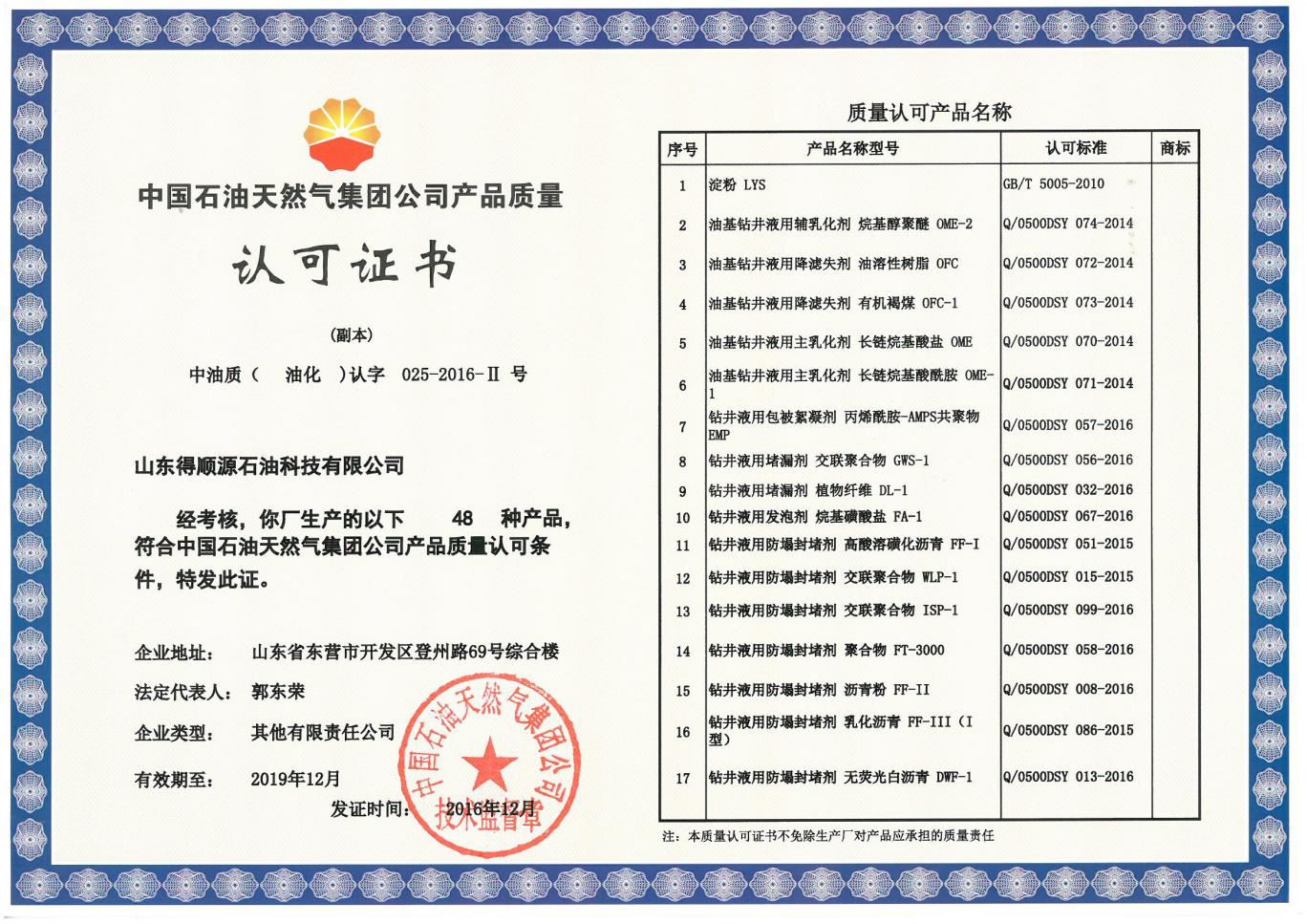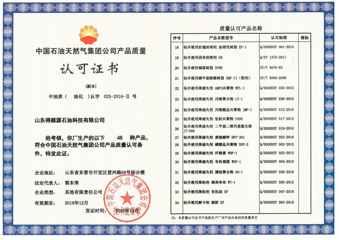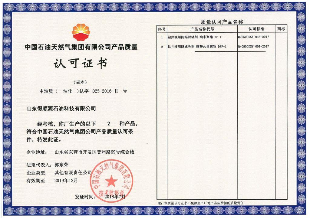 2018年公司新研發(fā)的兩個產(chǎn)品:(1)鉆井液用防塌封堵劑 納米聚酯NP-1和(2)鉆井液用降濾失劑 磺酸鹽共聚物DSP-1成功增加到中石油產(chǎn)品質(zhì)量認(rèn)可證內(nèi)。截止目前,公司在中石油產(chǎn)品質(zhì)量認(rèn)可證范圍內(nèi)的產(chǎn)品已經(jīng)增加至50個產(chǎn)品。