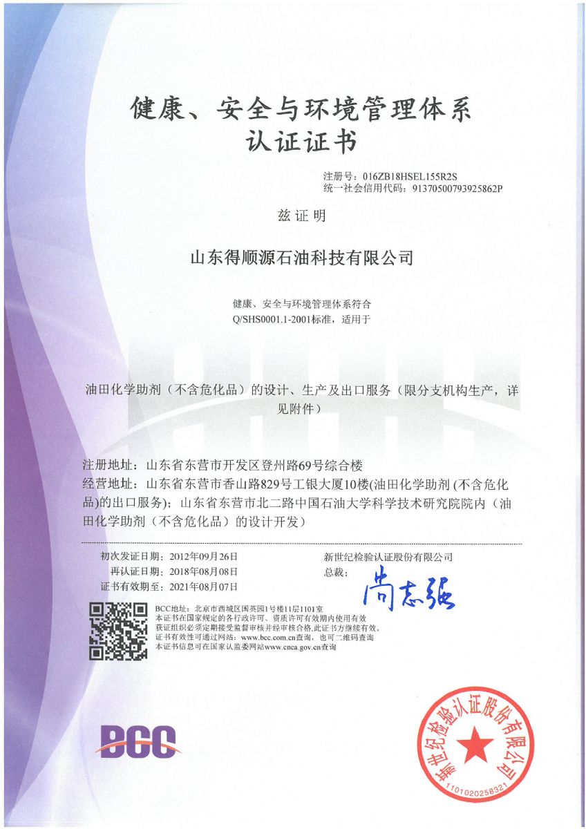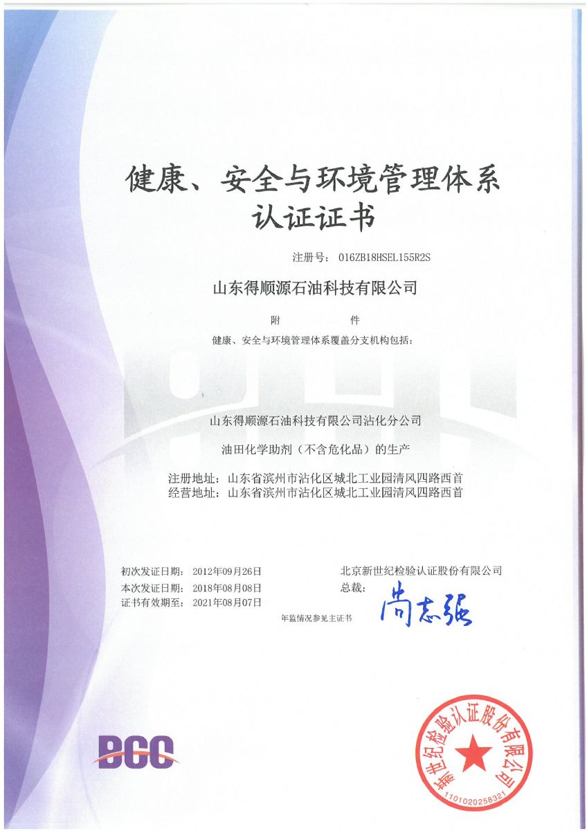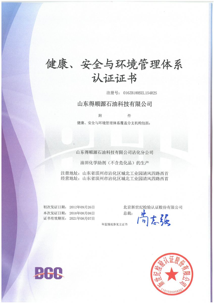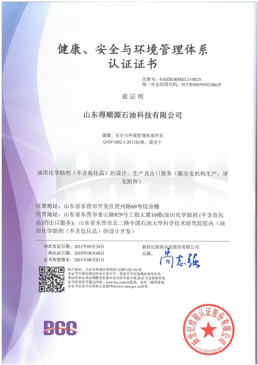 2018年8月,公司順利通過北京新世紀(jì)認(rèn)證公司關(guān)于HSE認(rèn)證的三年換證監(jiān)督審核,并收到了最新版的中石化和中石油HSE證書。