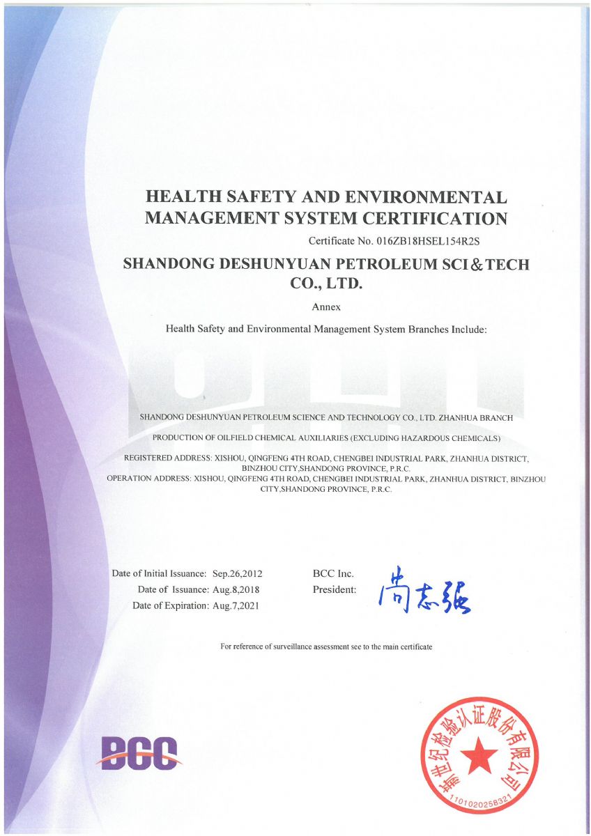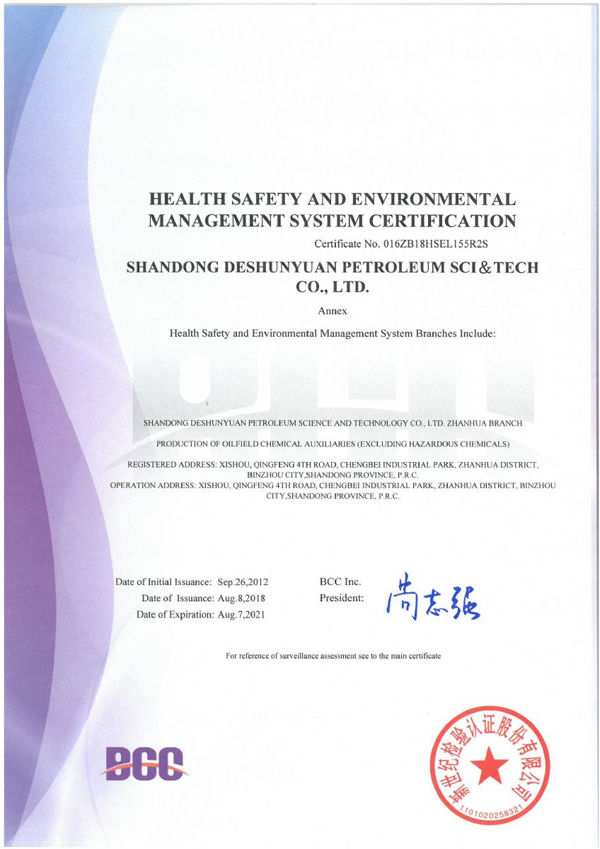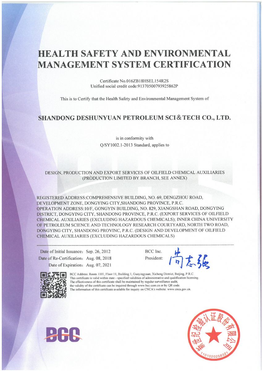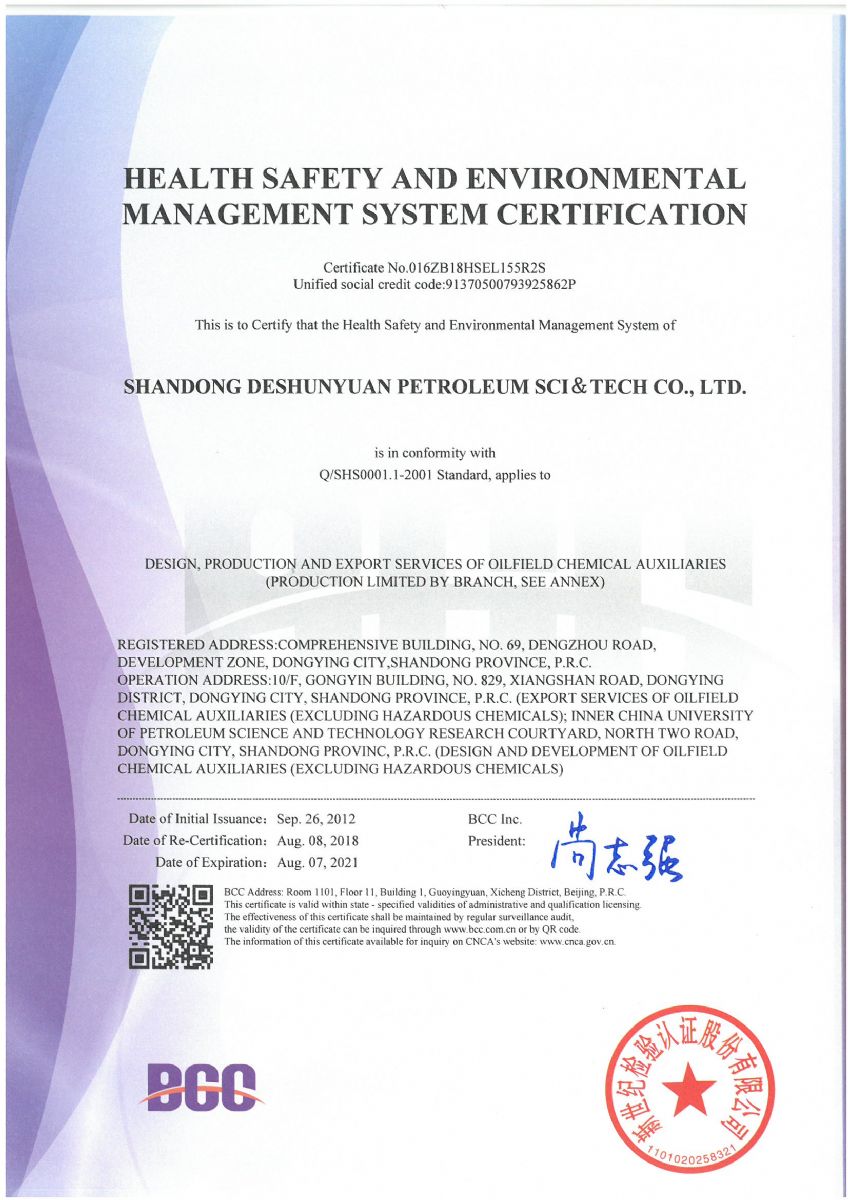 2018年8月,公司順利通過北京新世紀(jì)認(rèn)證公司關(guān)于HSE認(rèn)證的三年換證監(jiān)督審核,并收到了最新版的中石化和中石油HSE證書。